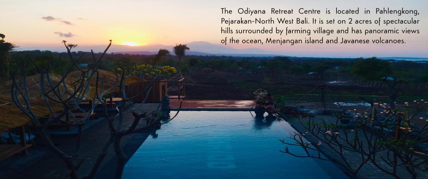 The Odiyana Bali Retreat Centre is located in Pahlengkong, Pejarakan-North West Bali. It is set on 2 acres of spectacular hills surrounded by farming village and has panoramic views of the ocean, Menjangan island and Javanese volcanoes, which makes it an inspiring location for meditation and yoga.
